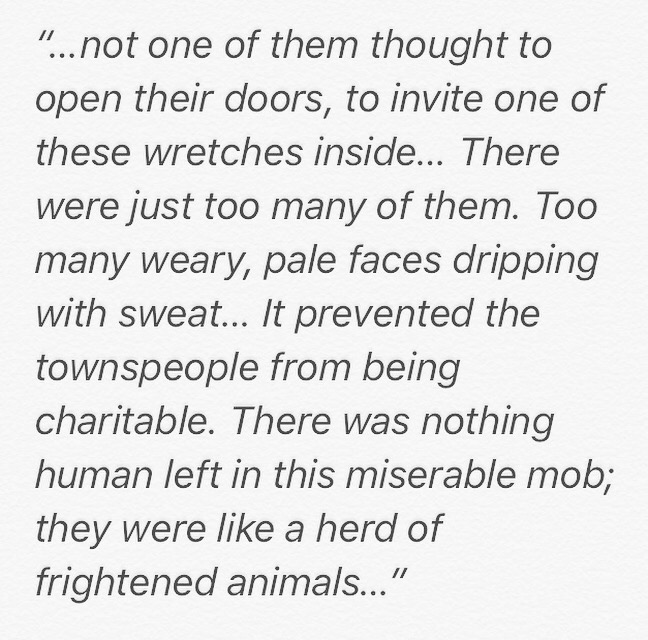 This is quoted from Irène Némirovsky’s novella Storm In June, the first Act in her WWII saga Suite Francaise. Némirovsky was a Ukrainian Jewish Refugee, who ultimately died in Auschwitz-Birkenau concentration camp. She knew all too well about which she was writing. Please remember that refugees do not flee their homes because they want to. They are trying to survive and to save their families. Remember that they are individuals and families, not a mass or a herd. They need help, not apathy. Do you not find it scary that in 2017 something that was written in 1942 is still so achingly current? When will we learn?