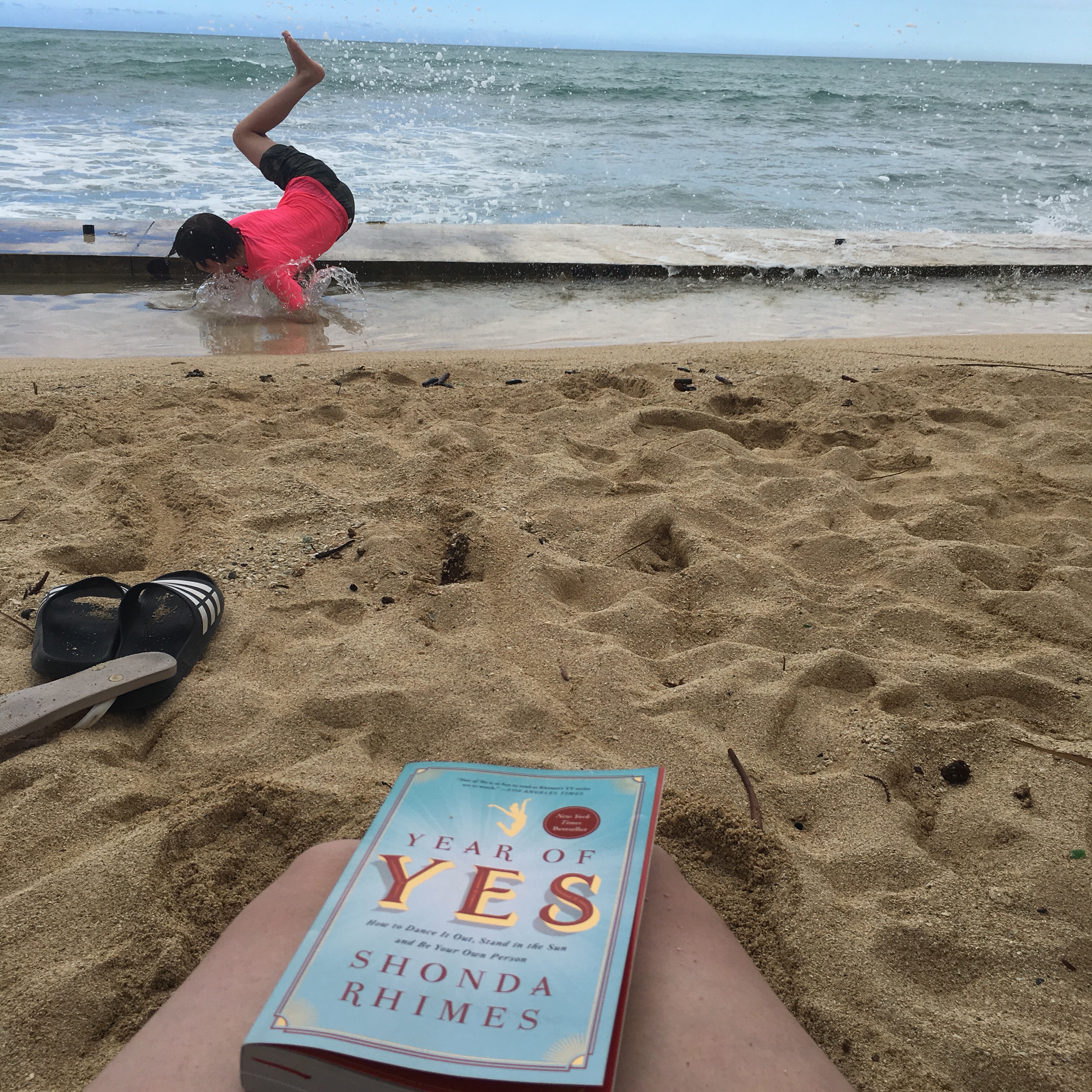 The view from the beach as a mom… my book, the sand, and my son throwing himself away from the waves.
