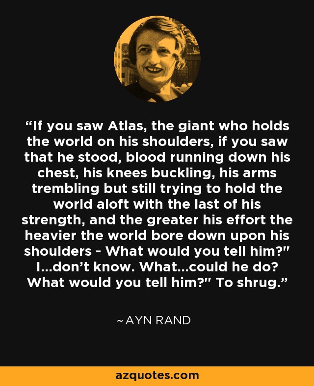In the second case, the position that I find myself in right now, I cannot bring myself to look the asker in the eye and say “I’m hurting. I’m in pain. I’m scared. I’m overwhelmed. I’m absolutely, 100% terrified. I feel like my life is falling apart, and I don’t have enough sandbags to keep it from breaking.” I do not want to say these things because I will cry. I am not ready to drop my aerial plate show. I need to make it through one more minute, one more hour, one more chore before I can sit down and allow myself to feel these things. I am not saying I am fine because you don’t care, I am saying that I am fine because I know that you do. I am desperately hoping that if I can keep saying that I am fine, I can be strong, and brave, and that I will make it through one more day without the levee fatally cracking. I know that when you ask how I am, and I say that I am fine, you really want me to look you in the eyes and you want to say “no, you’re not. Of course you’re not, and I am here for you.” I know that is what my friends and family and coworkers and acquaintances, and so on and so forth are thinking. I know that you you do genuinely care. I know that you want me to tell you the truth. I know that I am not saying that I am fine for your benefit; I am saying it for mine, because I have a job, and kids, and friends, and family, and I do not want to say I’m not. It’s so much easier to keep going if I am fine. It’s so much easier to not have the stressors that are trying to break me succeed if I am fine; because right now, my “I’m fine” is the mental equivalent to Atlas holding up the world. My “I’m fine” is keeping things in their place. And if I tell you the truth, it would be as if Atlas shrugged.
